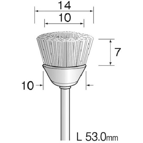 ・毛材:ナイロン・外径(mm):14・幅(mm):7・毛丈(mm):7・軸長(mm):36・軸径(mm):3.0・全長(mm):53・最高使用回転数(rpm):15000・形状:カップ型