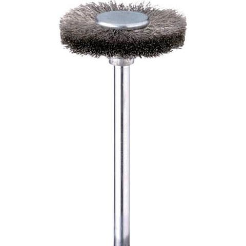 ・毛材:ステンレス・外径(mm):22・幅(mm):5・毛丈(mm):12・軸長(mm):34・軸径(mm):3.0・全長(mm):39・線径(mm):0.08・最高使用回転数(rpm):6000・形状:ホイール型