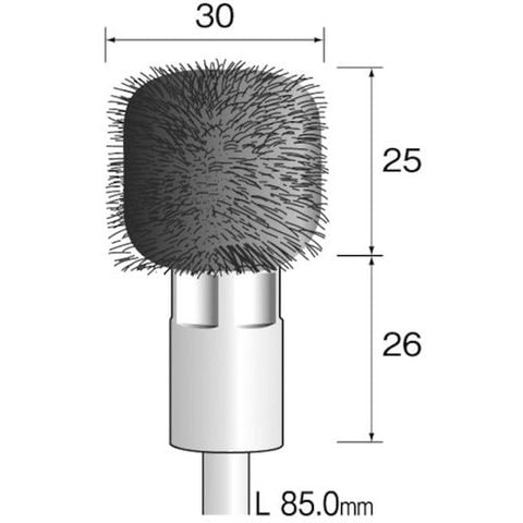 ・毛材:スチール・外径(mm):30・幅(mm):30・毛丈(mm):25・軸長(mm):60・軸径(mm):6.0・全長(mm):85・線径(mm):0.3・最高使用回転数(rpm):3000