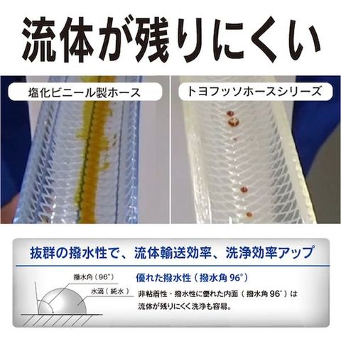 ・しなやかなので、狭所配管、可動部配管に最適です。・従来のフッ素ブレードホースに比べ柔らかく扱いやすいです。・非粘着・撥水性に優れた内面( 撥水角96°)で、流体輸送効率が良く、汚れも付きにくいので洗浄が簡単です。・透明度が高く、流体の確認ができ安心です。・耐薬品性、非溶出、非粘着、低臭などの特徴を活かし、幅広い設備配管用として使用できるフッ素ホースです。・【透明性】 透明度が高く、ホースの内面が汚れにくいので、流体の確認可能です。・【法適合】 食品衛生法適合(PL制度)、FDA(米国食品医薬品局)登録品、RoHS2修正規制適合で安全・安心です。
