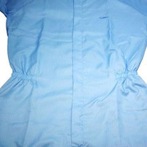 ・ISO Class6(Fed/STDクラス1000)相当品・衿部面ファスナー止め・センターファスナー・左胸ループ付き・左胸ペン差し、ループ付き・ウエストゴム絞り・導電糸5mmストライブ(黒)・クリーンルーム用ウエア
