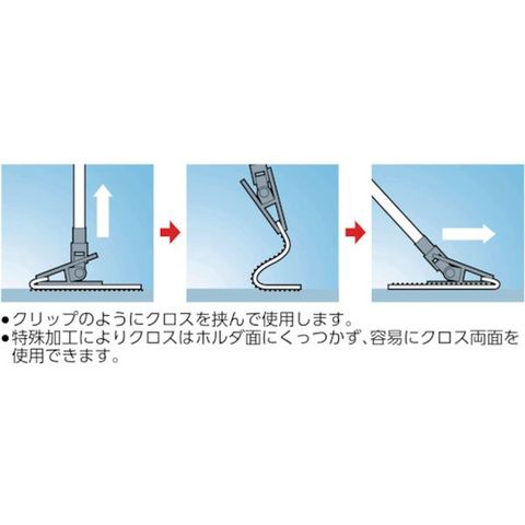 ・ワンタッチでダスタークロス、イージートラップダスターを取り付けられるクリップ構造です。・クロス両面を無駄なく使用できる二面構造です。・クロス表面、裏面の交換を、手を汚すことなく簡単に交換できます。