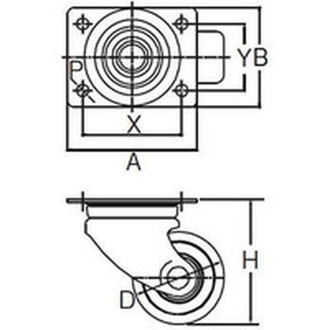 ・車輪径D(mm):65・タイプ:自在式・許容荷重(daN):254.8・許容荷重(kgf):260・車輪幅(mm):38・取付高H(mm):92・取付座A(mm):90・取付座B(mm):90・取付ピッチX(mm):71・取付ピッチY(mm):71・取付穴径P(mm):10.5