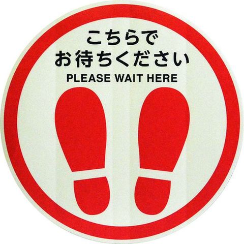 ・表示内容:こちらでお待ちください・取付仕様:粘着シール・縦(mm):300Φ・厚さ(mm):0.1・色:白・タイプ:マットタイプ・幅(mm):300・長さ(mm):300・形状:丸