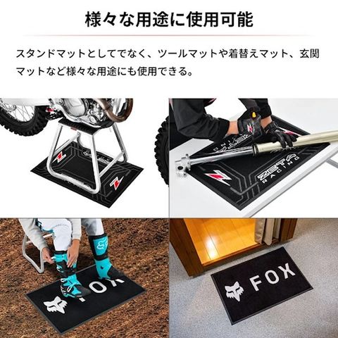 また、スタンドマットとしてでなく、ツールマットや着替えマット、玄関マットなど様々な用途にも使用できる。難燃素材を採用。