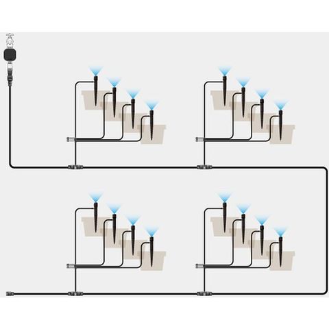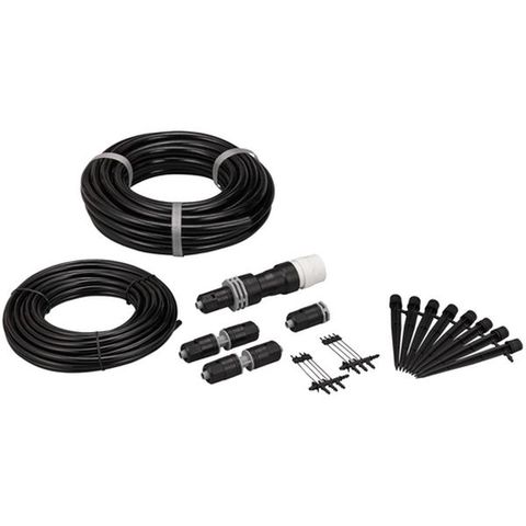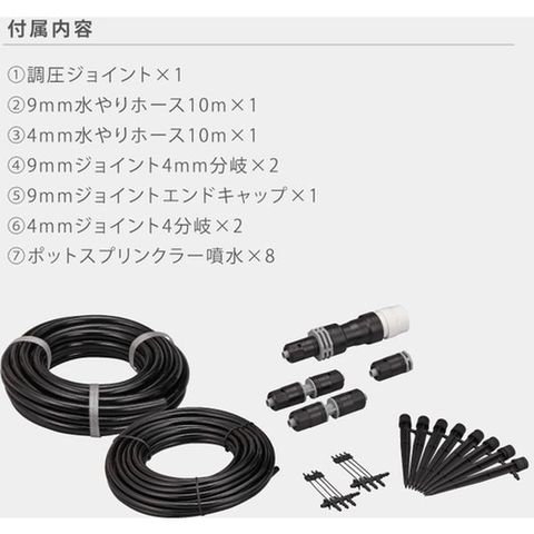 ・調圧ジョイント(1個)・9mm水やりホース10m(1巻)・4mm水やりホース10m(1巻)・9mmジョイント4mm分岐(2個)・9mmジョイントエンドキャップ(1個)・4mmジョイント4分岐(2個)・ポットスプリンクラー噴水(8本)