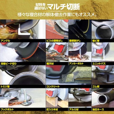 ・一般鉄鋼材、ステンレス、鋼管、薄鉄板、非鉄金属、樹脂、FRP、トミジ管、塩ビ管、ダクタイル鋳鉄管、スレート建材、モルタル、コンクリート、レンガ、ゴム製品、タイル、木材(釘・ビス入り)など