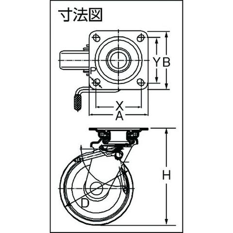 ・車輪径D(mm):75・タイプ:自在式(ダブルストッパー付)・許容荷重(daN):78.4・許容荷重(kgf):80・車輪幅(mm):30・取付高H(mm):100・取付座A(mm):81・取付座B(mm):81・取付ピッチX(mm):63・取付ピッチY(mm):63・取付穴径P(mm):9.5