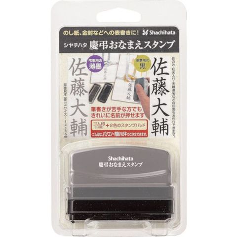 ・慶事用の黒と弔事用の薄墨の2色のスタンプパッド・ゴム印です。・まっすぐに捺せるスライドガイド付きで、ご祝儀やのし紙への表書きがカンタン・キレイにできます。・姓のみ、夫婦連名、社名入りなども作れます。