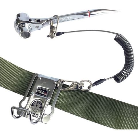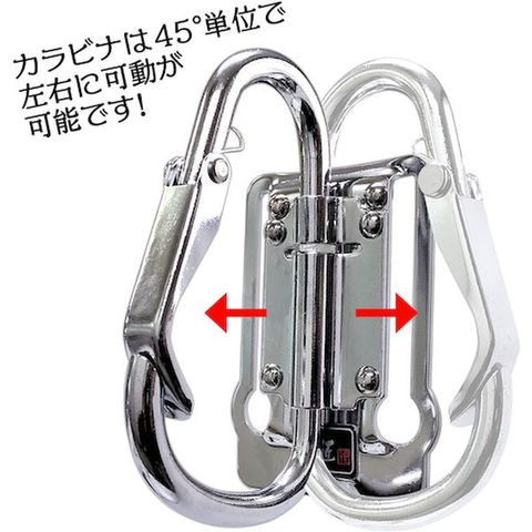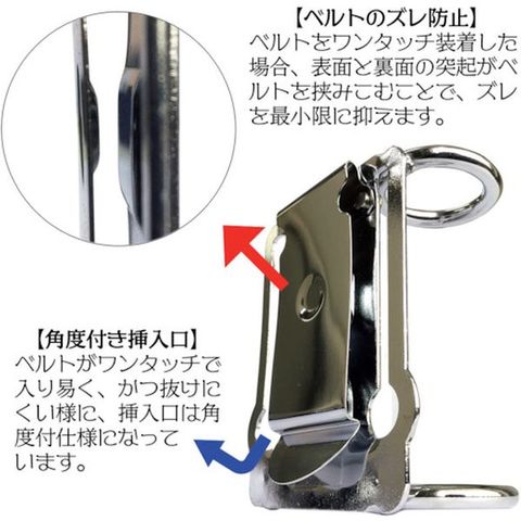 ・60mm幅までのベルトは本体に通してがっちり装着可能ができ、バネ鋼の差込口からベルトに挿入すればワンタッチ装着も可能です。・本体裏面はバネ鋼を使用し、さらに下部には落下防止用に角度が付いているのでベルトが外れにくい仕様となっています。・さらにバネ鋼中央部の突起がベルトを押さえ、ズレを最小限に留めます。・安全ロープを左右どちらに取り付けても、下部に丸型スペースを採用したことでフック金具が自由に動け、作業性がとても良いです。・軽量化にもつながっています。・フックのツメが中に湾曲しているため、工具の出し入れがスムーズで、カラビナは作業空間に合わせた三段階の可動式です。