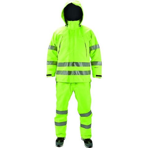 ・(株)前垣との共同開発によるゴアテックス高視認制電レインスーツです。・高視認性安全服JIS T 8127規格適合 Class3のレインスーツです。・最高クラスの視認性で夜間の作業中でも危険を回避します。・制電素材の使用により、静電気を軽減させ、引火性の高い物品を扱う作業所に適しています。・メットインフードでヘルメット装着時でも首元からの雨の浸入を防ぎ、視界と音も妨げないため安全に作業が可能です。