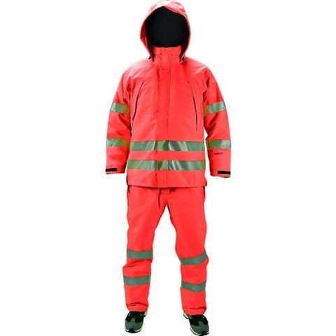 ・(株)前垣との共同開発によるゴアテックス高視認制電レインスーツです。・高視認性安全服JIS T 8127規格適合 Class3のレインスーツです。・最高クラスの視認性で夜間の作業中でも危険を回避します。・制電素材の使用により、静電気を軽減させ、引火性の高い物品を扱う作業所に適しています。・メットインフードでヘルメット装着時でも首元からの雨の浸入を防ぎ、視界と音も妨げないため安全に作業が可能です。
