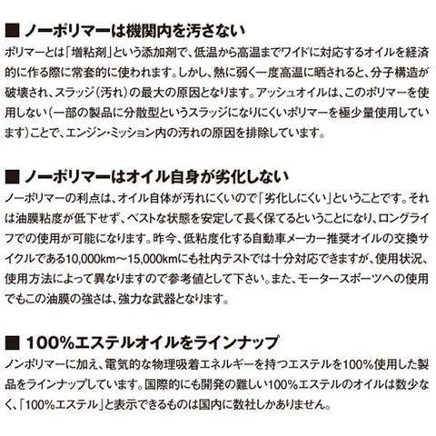 エステルをリッチに含むためエンジン保護性も非常に高く、また低フリクションで省燃費性も高いオイルです。本格的なモータースポーツはもちろんツーリング・高速走行・一般走行など使用条件を選びません。