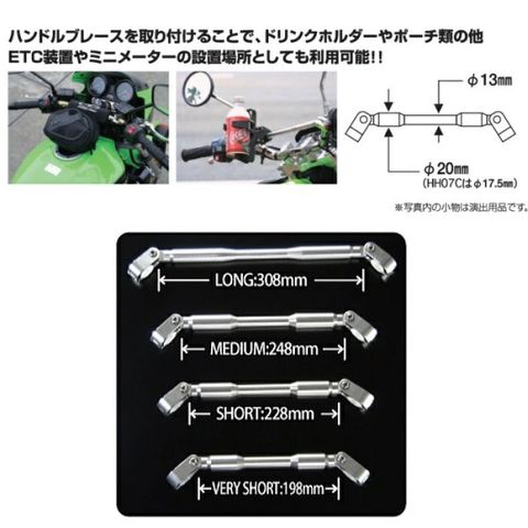 ノーマルのバーハンドルに強度を持たせ、ドレスアップパーツとしてもアクセントの利いた簡単取付のブレース。オンからオフまで対応できる4サイズを用意。カラーもHARDYハンドルバーに合わせた全7色(CHROMEはSHORT、MEDIUMのみ)をラインナップ。ブレースのなかった車体にスマホホルダー、ドリンクホルダー、ETCアンテナや、GPSデバイスの取り付け用のマウントベースと等が取り付け可能になります。