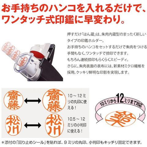 ・お手持ちのハンコを入れるだけで朱肉をつける手間もなくワンタッチ式印鑑に早変わりします。・連続捺印もらくらくスピーディーに行えます。・朱肉表面の表布には新素材ミクロ繊維を採用しています。・クッキリ鮮明な印影を表現します。