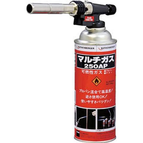 ・炎温度(℃):2100・内容量(g):190・タイプ:缶・火口外径(mm):16・軟ろう付:~φ2・適合ガス:マルチガス250AP(R355091)、マルチガス400AP(R35550)、マルチガスハイパワー300AP(R35504)・大きさ(mm):L180×W68×H228・硬ろう付:~φ11/8