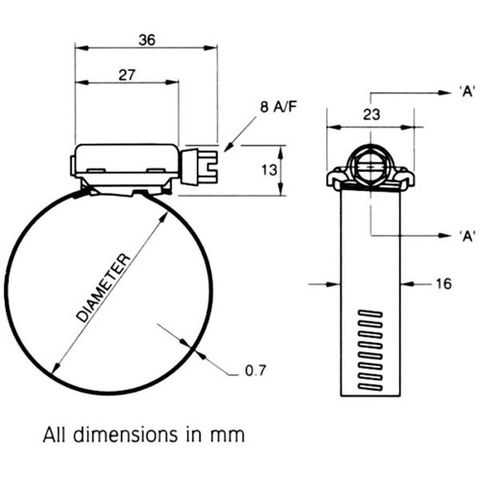 ・最大径(mm):500・最小径(mm):470・バンド幅(mm):16・厚さ(mm):0.7・締付トルク(N・m):11.9-17.0・6角ボルト(mm):8