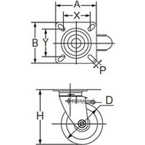 ・車輪径D(mm):130・タイプ:自在式(ダブルストッパー付)・許容荷重(daN):180・許容荷重(kgf):184・車輪幅(mm):38・取付高H(mm):177・取付座A(mm):110・取付座B(mm):110・取付ピッチX(mm):75~90・取付ピッチY(mm):75~90・取付穴径P(mm):11