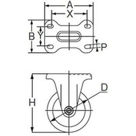 ・車輪径D(mm):150・タイプ:固定式・許容荷重(daN):200・許容荷重(kgf):204・車輪幅(mm):40・取付高H(mm):198・取付座A(mm):138・取付座B(mm):92・取付ピッチX(mm):100~112・取付ピッチY(mm):53~56・取付穴径P(mm):11