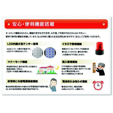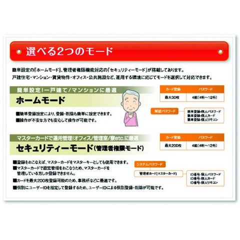 ・扉を閉めると自動でロック、オートロック機能を搭載しています。・手動ロック機能を搭載しており、オートロック機能と切替可能です。・運用に応じて選べる、簡単設定「ホームモード」、管理者権限「セキュリティーモード」搭載です。・セキュリティーモードは、マスターカードを所有する管理者のみ設定変更が可能です。・非常キー3本標準装備、故障時や電池切れの場合に非常キーで本機を解錠可能です。・マナーモードや電池切れお知らせ機能など様々な安心・便利機能を搭載しています。・室内機縦型仕様のため、様々な扉に取付可能です。