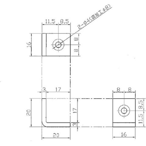 ・板厚(mm):3・W(mm):16・L1(mm):20・L2(mm):20・穴径(mm):4・穴数(個):2
