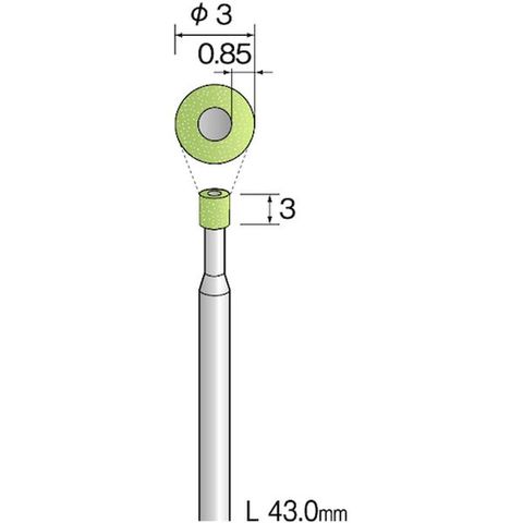 ・粒度(#):170・刃径(mm):3・刃長(mm):3・軸径(mm):3・全長(mm):43・最高使用回転数(rpm):67000