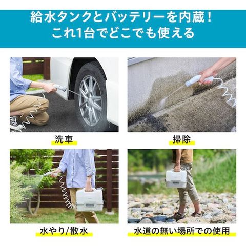 ・コンパクトで持ち運びがラクです。・電源や水道が無い場所でも使用することができる充電式ポータブルウォッシャーです。・充電式の為、延長コードを使用することなく、タンクに水を入れ本体に設置するだけで使用可能です。・掃除、洗車、レジャー、BBQなど、自宅や外出先で幅広く使用可能です。・小型ながらタンク容量が8Lと大容量で、連続使用可能時間も約24分と長く使えるので、様々な場所で使用できます。・3種類の吐出パターンを切り替え可能です。・場所や用途に合わせて、手元で簡単に切り替えできます。・タンク下の本体内にトリガーガンとホースが収納でき、気軽に持ち運べます。