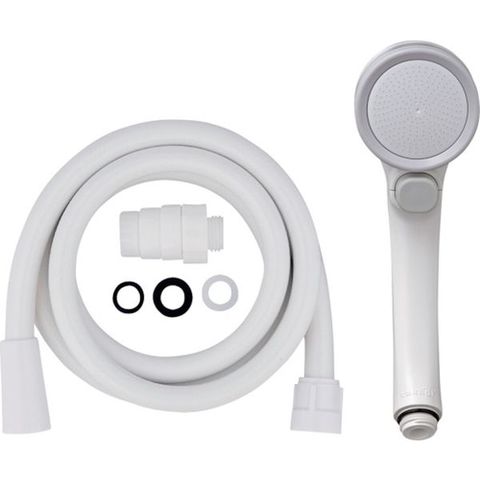 ・肌あたりのいい極細水流です。・ワイドシャワーでしっかり浴びられます。・節水、低水圧タイプです。・手元でストップできるストップボタン付きです。・シャワーホース付です。・各メーカー対応アダプター付です。