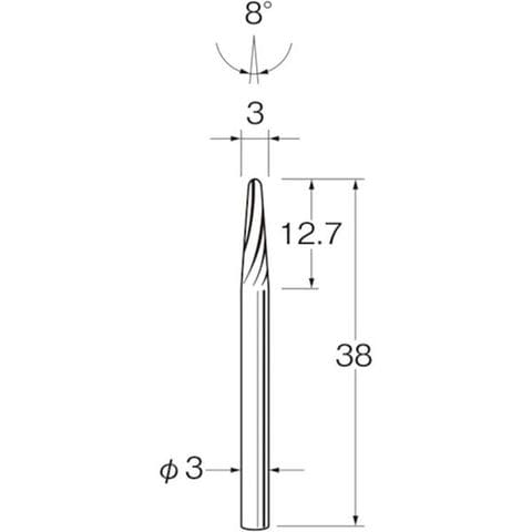 ・刃径(mm):3・刃長(mm):12.7・軸径(mm):3・タイプ:ロー付・最高使用回転数(rpm):40000・全長(mm):38・先端角(°):8