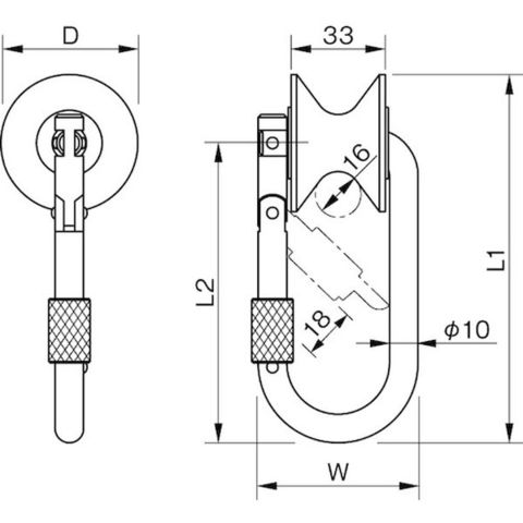 ・適合ロープ径(mm):16・使用荷重(kN):1・W(mm):57・D(mm):48・L1(mm):129・L2(mm):105