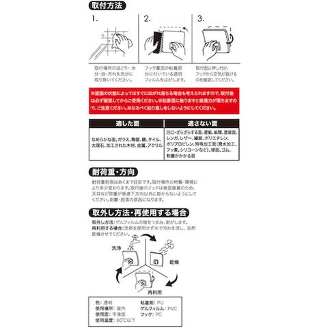 ・壁に画びょうやクギを開けず、フックを取り付けることができ、外すときも設置面に傷をつけず剥がすことができます。・一度はがしたものも水洗いですることで、再度取り付けることが可能です。