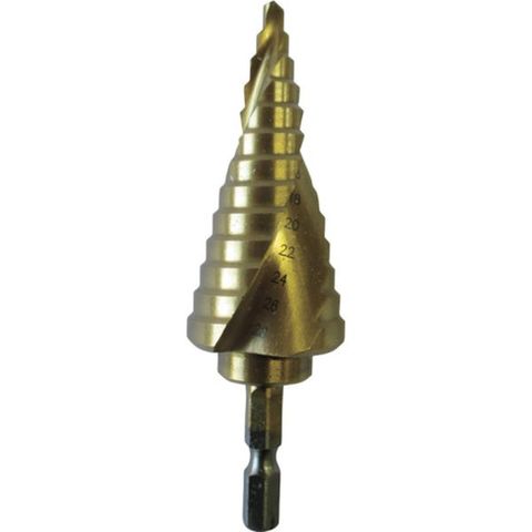 ・段数(段):13・シャンク径(mm):6.35・穴あけ寸法(φ):4・6・8・10・12・14・16・18・20・22・24・26・28・表面処理:チタンコーティング・穴あけ寸法(φmm):4・6・8・10・12・14・16・18・20・22・24・26・28・穴あけ寸法(mm):4・6・8・10・12・14・16・18・20・22・24・26・28