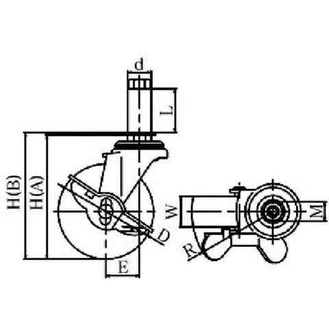 ・車輪径D(mm):50・タイプ:自在式(ストッパー付)・許容荷重(daN):30・許容荷重(kgf):30.6・車輪幅(mm):20・取付高H(mm):70・軸長L(mm):38・パイプ径d(mm):22・軸径(mm):22