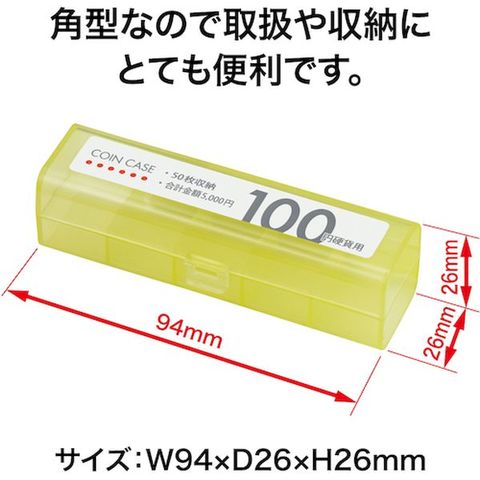 ・色:黄・硬貨収納枚数:100円 50枚・幅(mm):94・奥行(mm):26・高さ(mm):26