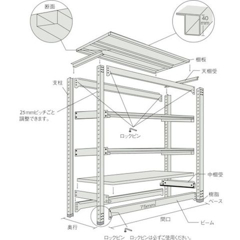 ・ボルトを1本も使用していないボルトレス構造で、分解・組み立て作業が簡単で、作業時間を大幅に短縮できます。・棚の段変更が、25mmピッチで、自由に調整、変更ができます。・高さ、奥行が同じであれば、増結することができます。また、支柱を兼用することにより、コストダウンが図れます。・優れた断面構造で、荷重、横からのねじれにも強いC型形状の支柱を採用しています。・樹脂ベースの使用により、床を傷つけません。