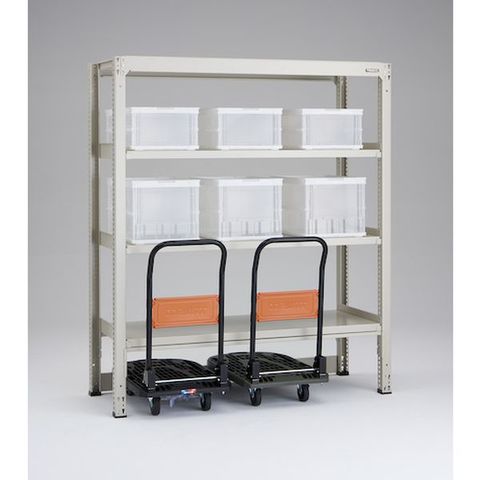 ・台車の天板高さに合わせて下段高さを調節することにより台車の天板部分を収納できスペースが有効に使えます。・高さ、奥行が同じであれば、増結することができます。・連結する際は支柱を兼用するので、コストダウンが図れます。・高さ320mmまでの台車を収納することができます。・優れた断面構造で、荷重、横からのねじれにも強いC型形状の支柱を採用しています。・樹脂ベースの使用により、床を傷つけません。