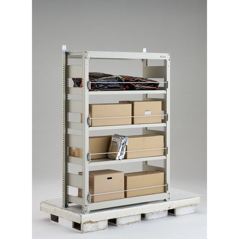 ・本体の転倒防止用金具と荷物の落下防止用に回転式のバーを備えた災害備蓄ラックです。・棚板の位置を25mmピッチで調整できるため、備蓄品に合わせて細かく高さが変更ができます。・高さ、奥行が同じであれば支柱を兼用して連結することでコストダウンが図れます。・積載物が飛び出すことを防ぐバーは回転式なので、緊急時の備蓄の出し入れが容易です。・優れた断面構造で、荷重、横からのねじれにも強いC型形状の支柱を採用しています。・樹脂ベースの使用により、床を傷つけません。