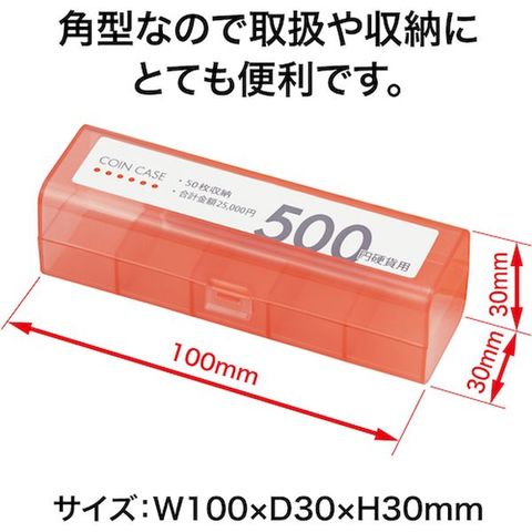 ・色:赤・硬貨収納枚数:500円 50枚・幅(mm):100・奥行(mm):30・高さ(mm):30