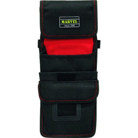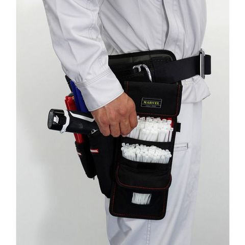 ・3サイズ収納できる3段式ホルダーです。・持ち運び時はフタを閉じ、作業時はフタをマジックテープで止めておくことができます。・フタの先端(5cm)生地の内側に樹脂板を入れている為、前にたれてこず、作業性が上がります。・ポケット位置を取り出しやすい高さのバランスで考えているので作業性が良いです。・装着はベルト通しとカラビナの2方法からお選び頂けます。・100mmのポケットには取り出し口付です。