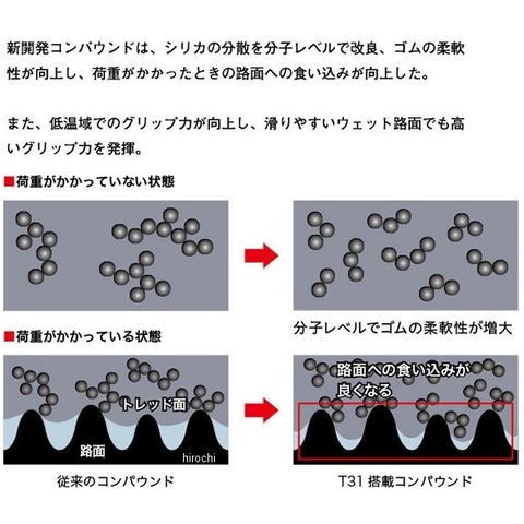 新開発のコンパウンドは、シリカの分散を分子レベルで改良、ゴムの柔軟性があがることで、荷重がかかった時にゴムが路面凹凸へ食い込みやすくなり、且つ分子を動きやすくすることでエネルギーロスを発生させ、グリップ性能向上に貢献。