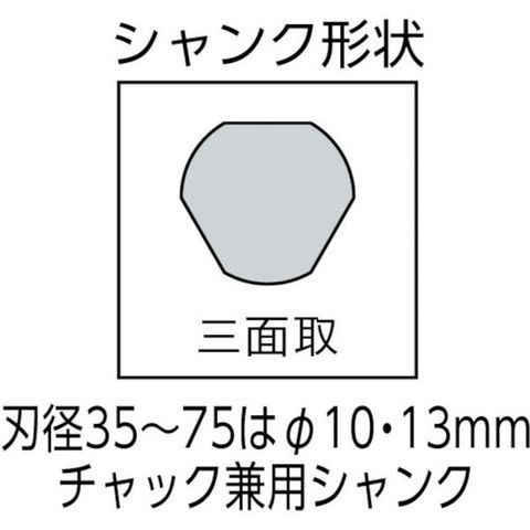 ・刃径(mm):75・ふところ深さ(mm):37・シャンク形状:三面取(ストレート)・シャンク径(mm):10・13・刃厚(mm):2.8・有効切削能力(mm):金属サイディング35mm、ステンレス板10mm、パイプ材10mm、アルミ板5mm・適合機種:電気ドリル、ボール盤、振動ドリル(回転モード)