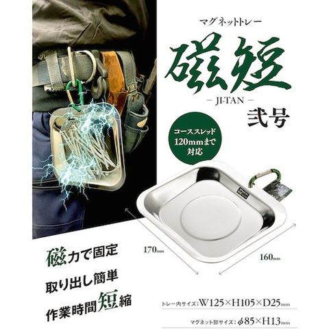 ・ステープルやビスなどが固定でき、簡単に取り出せるので、作業の時短に最適です。・コーススレッド120mmまで対応可能です。・トレー本体は傾斜があり、カラビナで取り付けた際は体への密着性を高め、不意な跳ね上がりを防止するとともに、ビスなどが取りやすい形状になっています。・カラビナ付で腰回りやハーネスなどに取付可能です。・腰回りに彩りを与えるカラーバリエーションがあります。
