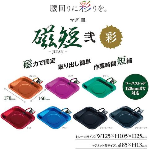 ・ステープルやビスなどが固定でき、簡単に取り出せるので、作業の時短に最適です。・コーススレッド120mmまで対応可能です。・トレー本体は傾斜があり、カラビナで取り付けた際は体への密着性を高め、不意な跳ね上がりを防止するとともに、ビスなどが取りやすい形状になっています。・カラビナ付で腰回りやハーネスなどに取付可能です。・腰回りに彩りを与えるカラーバリエーションがあります。