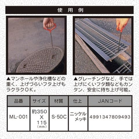 ・フック部は薄く仕上げてありますので細目のグレーチングにも使用できます。・ソフトグリップ仕様で手にやさしい仕上げにしています。・コンパクトサイズなので、コンテナや土嚢袋を移動する際の手カギとしても使用可能です。