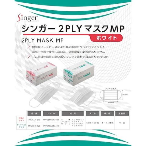 MP2ELRWB 宇都宮製作(株) シンガー シンガー2PLYマスク MP(50枚入) 耳掛け