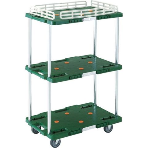 ・荷台は堅牢なリブ構造です。・薬品や溶剤にも侵されにくく耐久性に優れています。・台上に滑り止め用ゴムが4ヵ所ついています。・上部天板に柵が付いていて荷崩れを防止します。(軽量物の積載時)