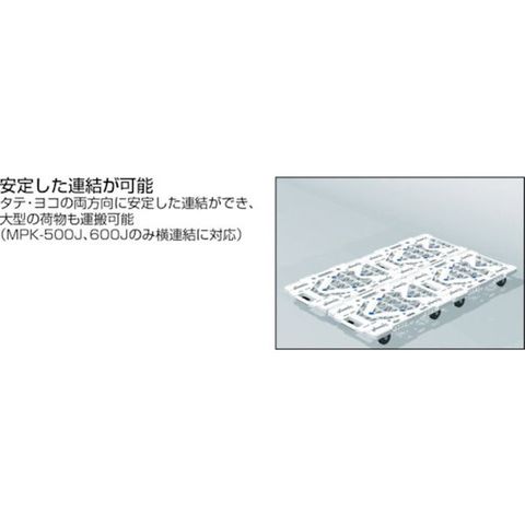 ・メッシュ構造の採用で、従来品よりさらに軽量で移動が簡単です。・縦・横方向に連結が可能です。(縦連結はオール自在キャスター仕様、オール自在ストッパー付キャスター仕様のみ)・スタッキング可能です。・荷台は堅牢なメッシュリブ構造です。・薬品や溶剤にも侵されにくく耐久性に優れています。・台上に滑り止め用ゴムが4ヵ所ついています。・エラストマー樹脂車輪の採用でタイヤ痕がつくのを軽減します。・ルートバンMP-600用コーナーストッパーの取り付けが可能です。(MPK-600シリーズ)