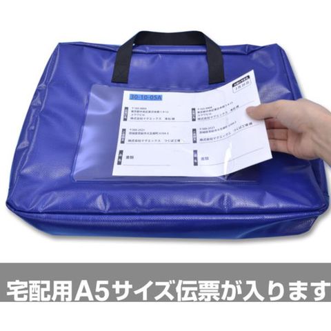 ・水滴が進入しにくい止水ファスナー・A5マルチ伝票が入る、宛名書きカード用ポケット付・封印用結束バンド付・錠前を掛けられるダブルファスナー