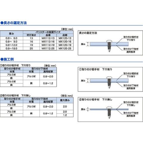 ・最大適合板厚(mm):アルミ板(0.8~2.0)・鉄板(0.8~1.2)・頭部径(mm):8.0・頭部厚さ(mm):1.6・適合ドライバー:プラスNo.2・呼び寸法(mm)d×L:M4×25