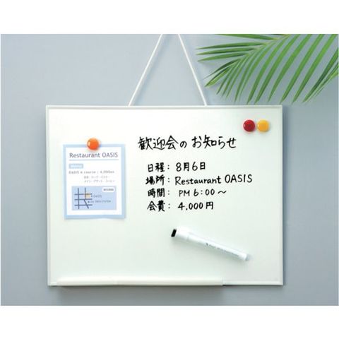 ・プラスチックフレームの軽量ホワイトボードです。・縦でも横でも使えます。・裏面に吊り下げ金具を付けて壁面に吊るせます。